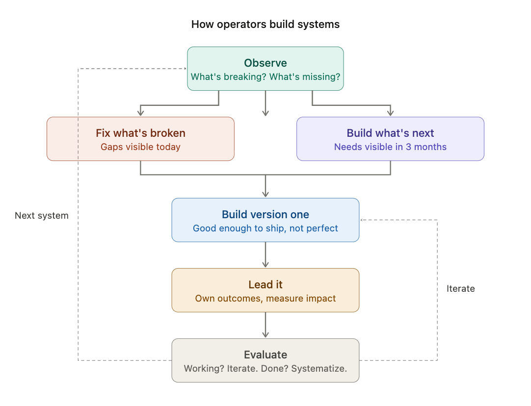 A lot of people can identify a gap, and some of them will even build a first version of something to address it. But most people stop there. They hand it off, or they move on before anyone knows whether the thing actually worked. The operator mindset doesn’t let you do that. You build the feedback system and then you own it until the product team is actively changing roadmap priorities based on what it surfaces. You build the recruiting operation and then you run it until it’s generating consistent results and the team can sustain it without you in every decision. You don’t get to say “I built it” unless you can also say “and here’s what happened because of it.”
